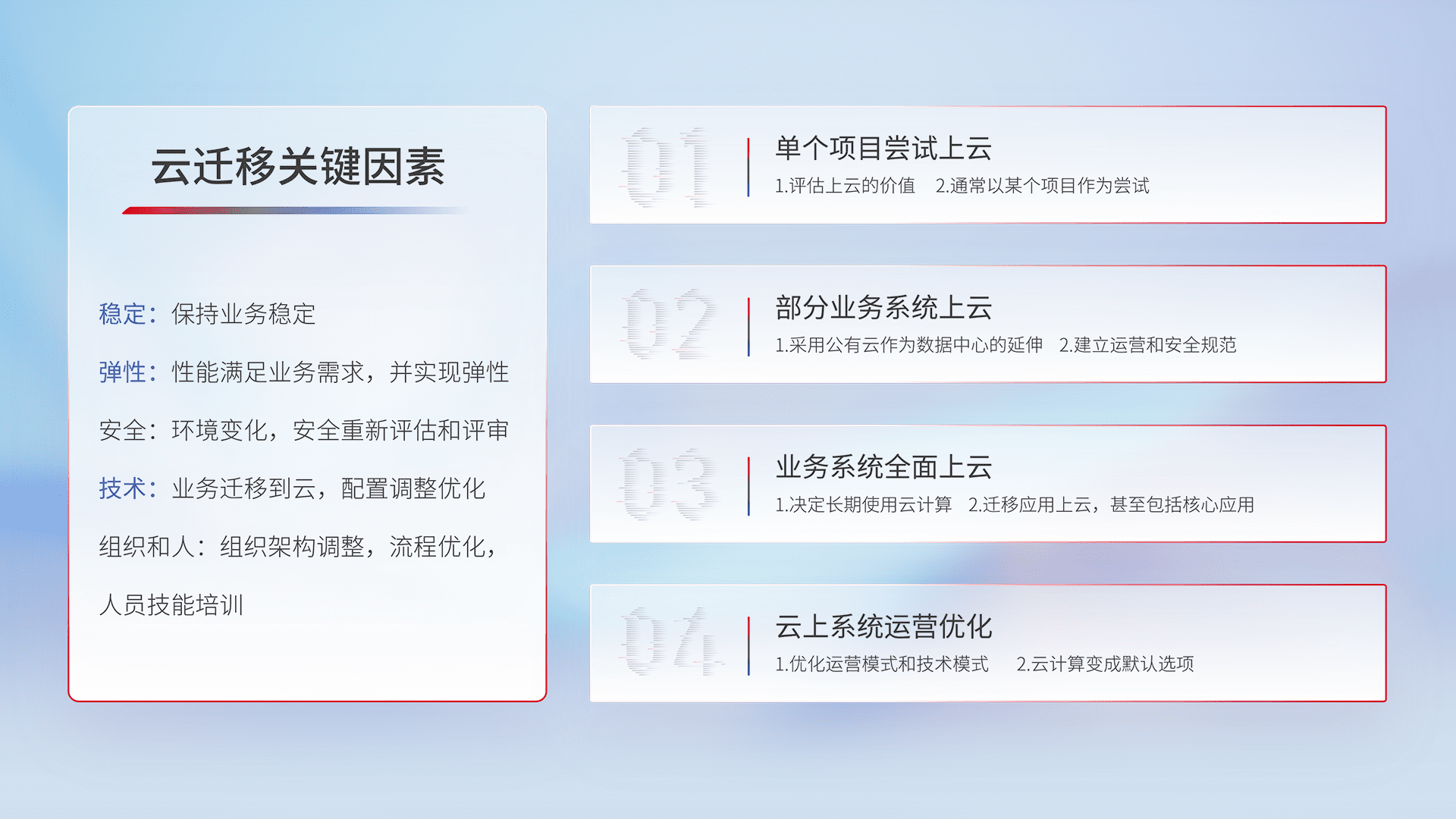 结合实际业务,,从规划设计、、云平台选型、、、、云原生改造、、、、数据迁移、、、、集成交付,,,迁移全过程为客户识别最佳上云路径,,做好风险识别管理,,设计网络架构、、身份权限、、、安全审计合规、、、、操作审计、、、日志审计、、、、监控告警策略、、、、多站点容灾设计等,,,,对云上基础设施进行整体规划,,,,提升IT治理水平,,以满足弹性、、高可用、、、高性能的需求。。。。